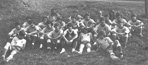 Bill Gerrish, Alan Britton, Ed Chambers, Dana Rattray, Danny Lainey, Rick Collins, Albert Allen, and Rudy St. Jean. 2nd Row: Tim Charette, Rick Briggs, David Stephenson, Mark Wilcox, Mark Condon, Mark Lougee, and Ted Stone. 3rd Row: Coach Elliott, Mike McHugh, Beth Randolph (Manager), John Murchison, Mike Stephenson, Trudy Lagerstrom (Manager), and Kevin Forbes. Absent from the picture DeeDee Footer (Manager)